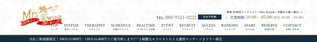 | Mrs.美witch(ミセスビウィッチ)~美魔女の癒し魔法~ | 80分11,000円~ | 9.5/10 | |